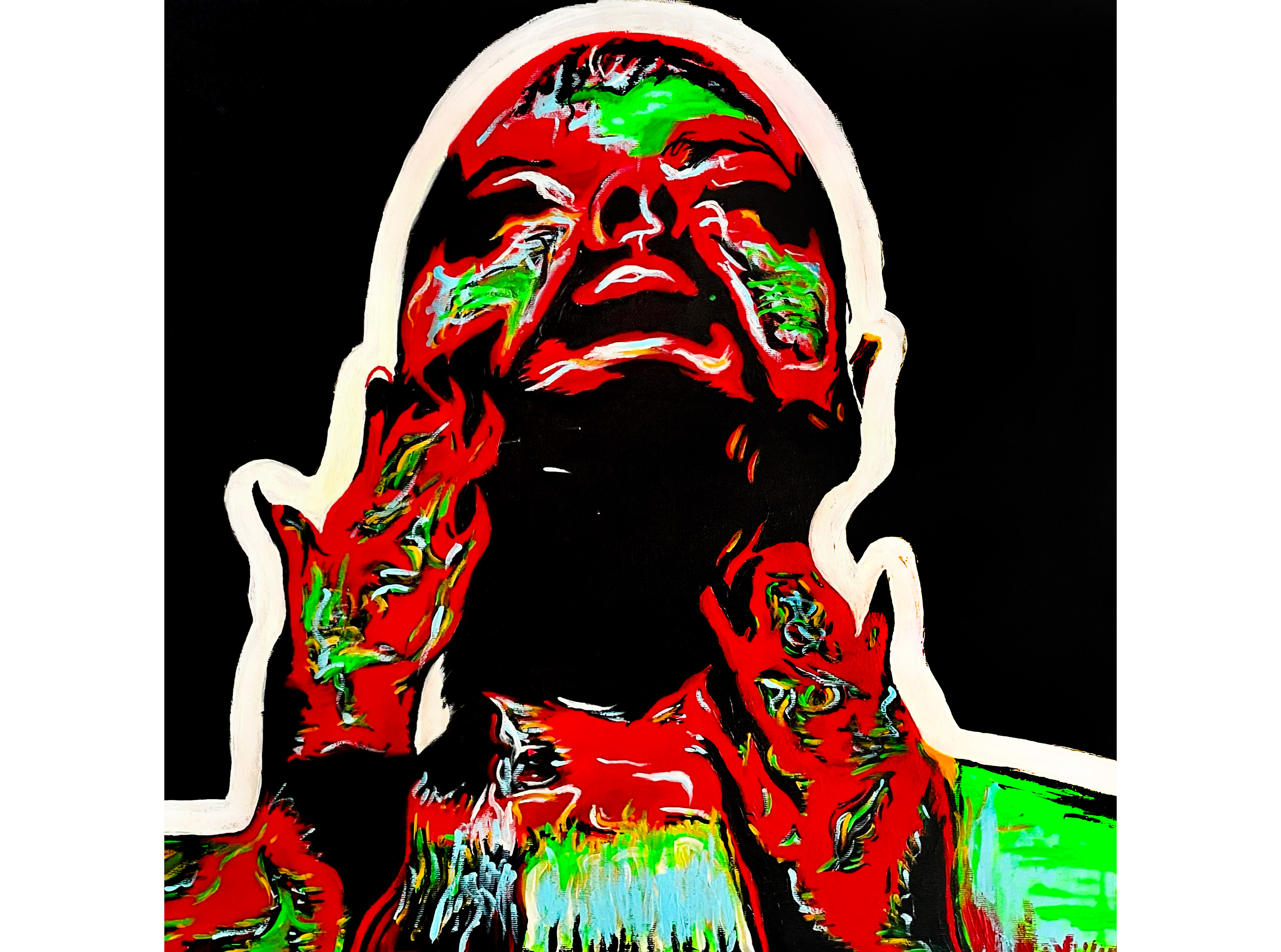 The figure emerges from a black void, its edges roughly delineated in a pale halo-like outline — a boundary that marks presence but also fragility. The head is tilted back, the mouth slightly open, hands grasping the face: a pose that wavers between rapture and breakdown, ecstasy and suffocation. In Christian iconography, it recalls the upward gaze of saints in ecstasy — Bernini’s St. Teresa, or Caravaggio’s Mary Magdalene in Ecstasy. But here, that moment is corrupted, electrified, rendered in acid green, bruised crimson, and searing white.